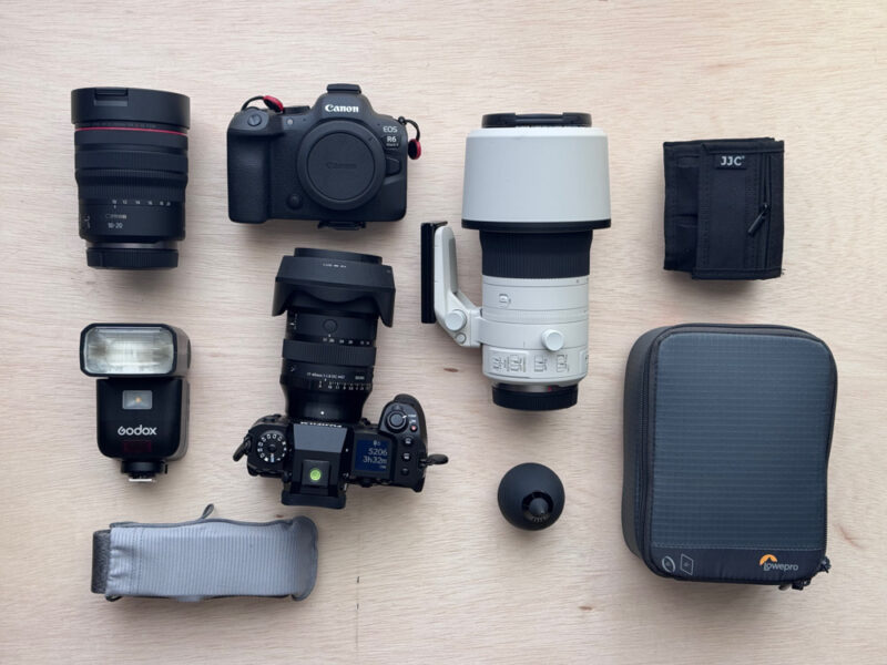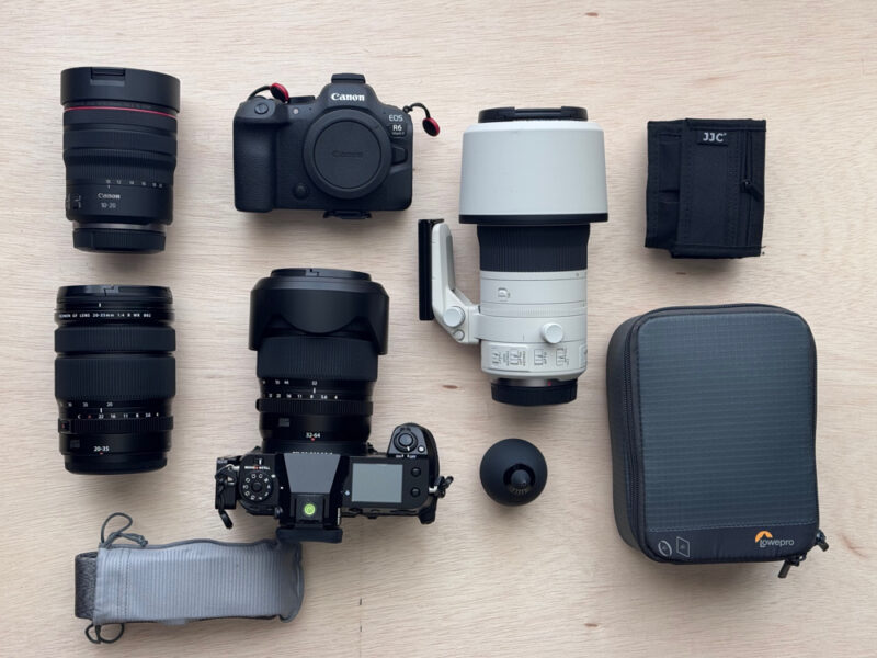 まずはフジフィルムGFXとキヤノンを組み合わせた、自分にとってはガッツリ撮影時の構成です。広角〜標準域はミディアムフォーマットのGFXで、超広角/望遠域はキヤノンのフルサイズ機に振り分けています。