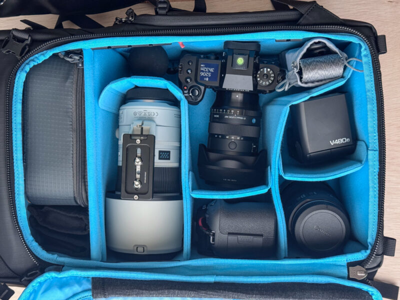 この他にノートPC(例 MacBook Pro 14″ 約1600g)や予備バッテリーを入れるとギリ10kg以内でしょうか。安全を期すならフィルターなどのアクセサリ類は預け入れ荷物に入れた方が良さそうです。